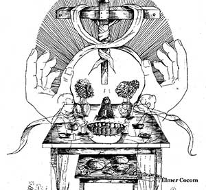candelabros, retratos, y cosas de aparente antigüedad. Manteles, dulces de pan o mazapán, vasijas