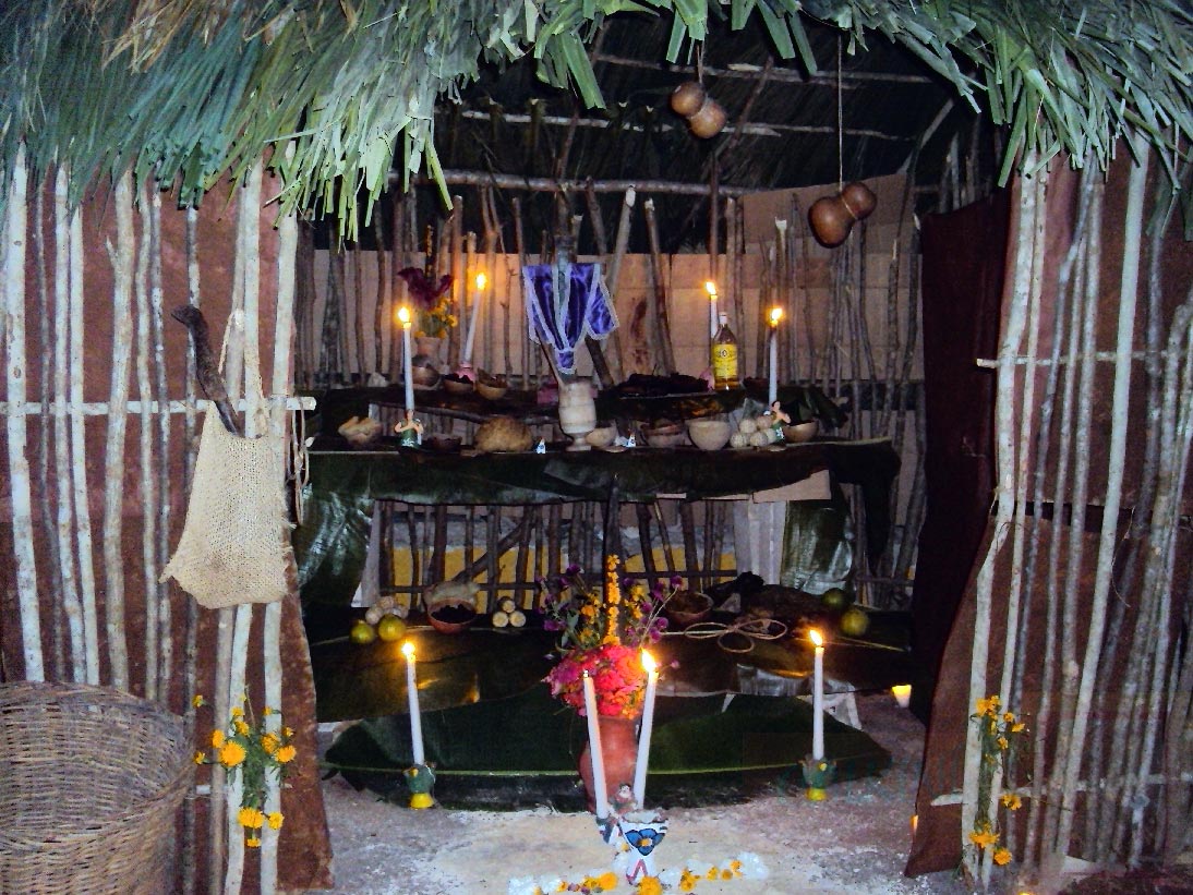 Uno de los elementos específicos, es el altar para honrar la memoria de los seres fallecidos, cubierto por un mantel bordado especialmente para la ocasión; la mesa con flores, imágenes religiosas y en el centro, los retratos de los muertos, luce en un lugar exclusivo de la casa; permanece servida para la visita de los espíritus de los muertos y también para que los vivos, una vez cumplida la ofrenda degusten alimentos, postres y bebidas.