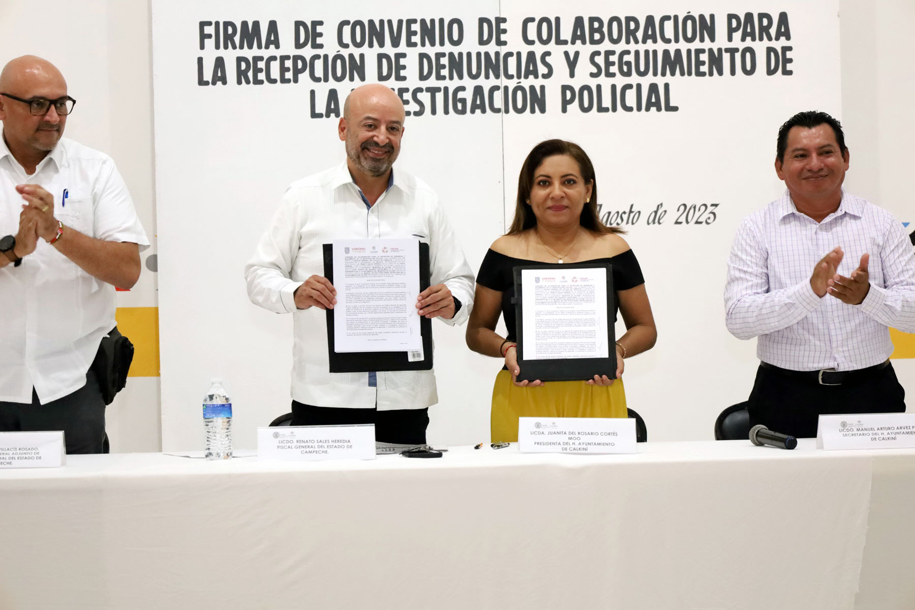 Al realizar la rúbrica con el fiscal general del estado de Campeche, la alcaldesa celebró la firma de este acuerdo sin precedentes, toda vez que contribuirá en primera instancia a la captación de mayores denuncias por parte de las víctimas, pero primordialmente a tener mayores alcances en las líneas de investigación, donde la Policía Municipal contribuirá con datos de prueba a la Fiscalía General del Estado de Campeche, al ser los primeros respondientes en el lugar del hecho.