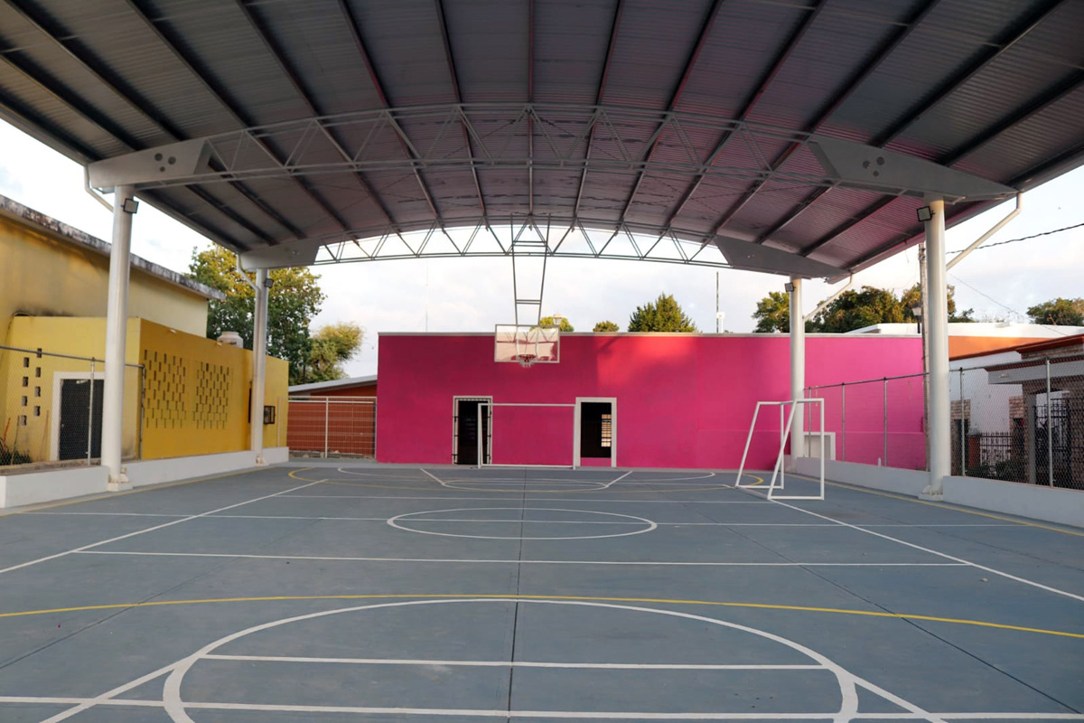 Esta obra se ubica a un costado del parque principal y los trabajos consistieron en la demolición de la antigua cancha y techumbre en mal estado, excavación para el colado de zapatas y dados, columnas, trabes de acero montenes y colocación de láminas, así como la realización del nuevo piso de la cancha pintada, tableros flotantes, porterías, iluminación, malla acero para la entrada, colocación de mallas protectoras a los costados, colado del piso estampado del andador a un costado de la cancha, muros de block, aplanados y pintura de toda la obra, finalizando con la limpieza general, según explicó el director de Obras Públicas y Desarrollo Urbano. |