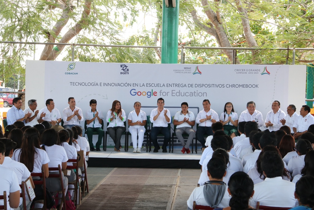 Dentro del programa Google for Education, el gobernador Alejandro Moreno Cárdenas entregó dispositivos chromebook a estudiantes de nivel medio superior de este municipio, durante un evento realizado en la cancha techada del barrio San Luisito de esta ciudad.