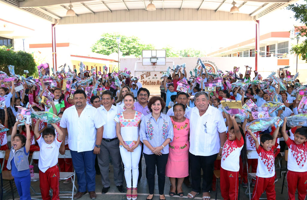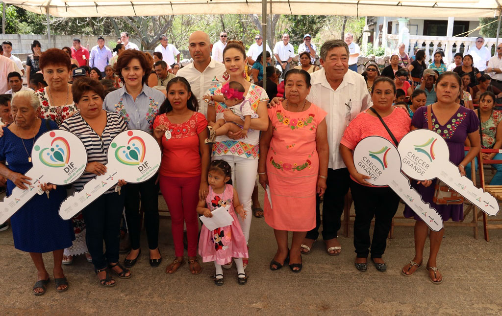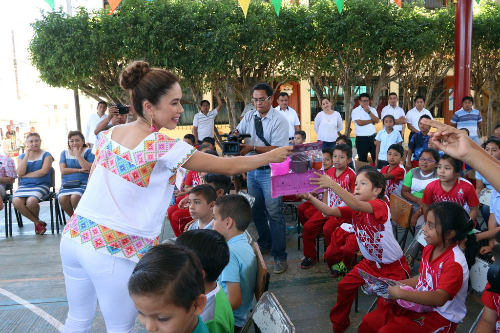 La presidenta del patronado para el Desarrollo Integral de la Familia (DIF) del Estado, Christelle Castañón de Moreno, encabezó la entrega de viviendas en la modalidad de cuartos adicionales a familias de escasos recursos del municipio de Calkiní, y convivió con alumnos de la escuela primaria “Mateo Reyes” como parte de la gira del Día del Niño y Día de la Madre 2018.
