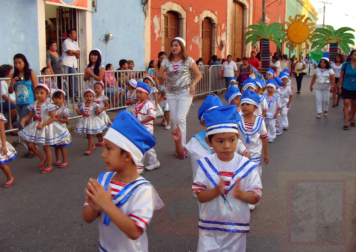 Los niños (alrededor de 2,500) hicieron su aparición a las 5:00 de la tarde, luciendo infinidad de trajes, disfraces: pinguinos, payasitos, marineros, ratoncitos, rumberos... como lo hizo el jardín "Dra. María Montessori" que recordó al rey del mambo, Dámaso Pérez Prado: numerosos pequeños vistieron los tradicionales trajes de rumberos.