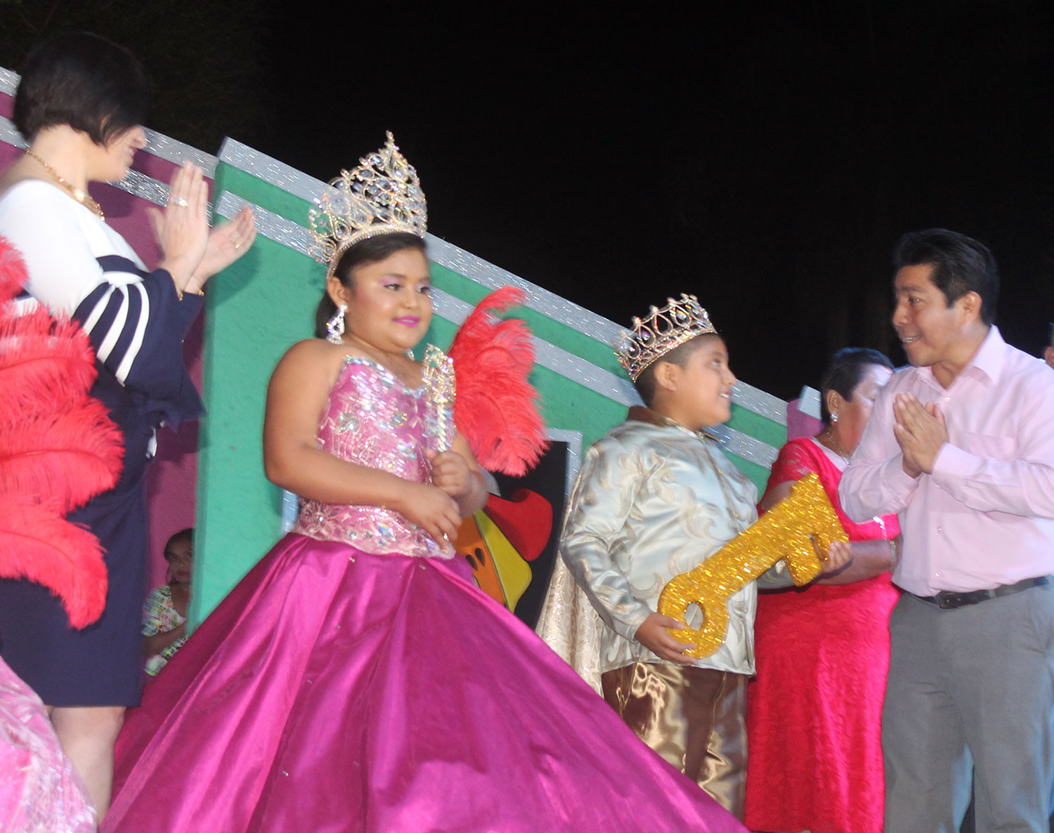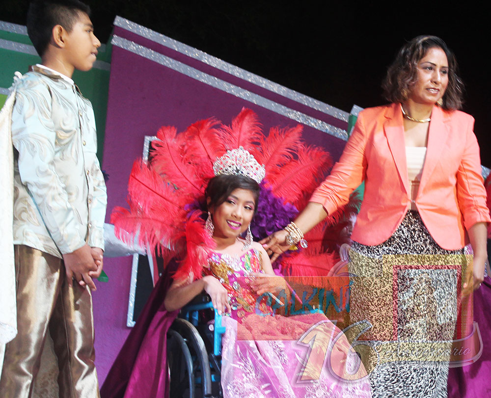 El teatro al aire libre fue engalanado por los pajes, que preludiaron la entrada de los reyes del programa Discapacidad, Karen del Carmen y José Eduardo; de NAA ((Niños, Niñas y Adolescentes), Nayeli Milagros y Jesús Jardiel; y del Adulto Mayor (soberanos de la Tercera Edad), María Elda y Héctor.