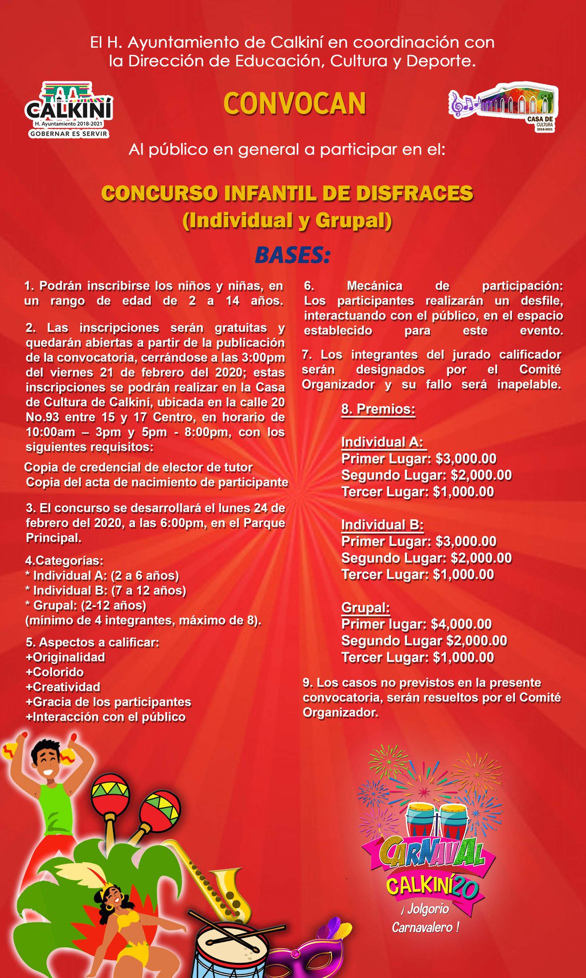 2. Las inscripciones serán gratuitas y quedarán abiertas a partir de la publicación de la convocatoria, cerrándose a las 3:00 p.m. del viernes 21 de febrero del 2020; estas inscripciones se podrán realizar en la Casa de Cultura de Calkiní, ubicada en la calle 20 No. 93, entre 15 y 17 Centro, en horario de 10:00 a.m. - 3:00 p.m., y 5:00 p.m. - 8:00 p.m., con los siguientes requisitos: