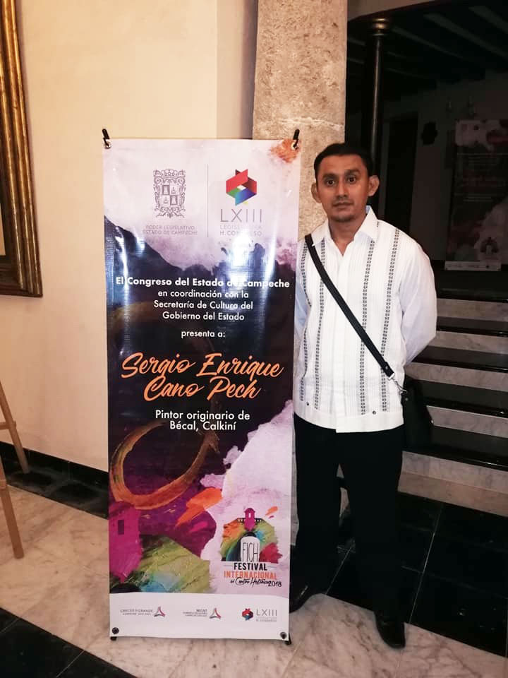 Los colores adquieren vida y movimiento en cada una de los lienzos de Sergio Enrique, pintor becaleño, cuyas obras captan las raíces de la tierra que lo vio crecer. Originario de la Cuna del sombrero de jipi y palma, rincón campechano de coloridos paisajes matinales, mujeres mestizas ruborizadas al calor de la leña, artesanos cuyas manos afanosas tejen la blancura de finos sombreros, coloridas piezas ornamentales que embellecen a las mujeres; su empeño por matizar los sonidos jaraneros en piezas multicolores de mestizas y vaquerías. También regala la delicia de frutas, aves polícromas descansan en el follaje, miradas profundas, rostros lozanos o desgastados con las huellas del tiempo, sonrisas encendidas como las flores del flamboyán, estén presentes en los lienzos.