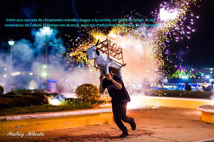 ─¡Ahí viene¡ ¡Sí, ahí viene¡ ─grita histérica la muchedumbre en el coso pavimentado. Es un ser híbrido, un minotauro, un toro-humano; se acerca, entre descomunales bufidos, en una carrera estrepitosa por toda la calle asfaltada o en los rincones del jardín, frente al templo de San Luis Obispo, en un intento inútil por embestir al multicéfalo quien no se deja, se deshace en cada acometida; se presenta envuelto en piel de bolsa sintética; hoy de cuero blanco; ayer de pita; mañana, tal vez, un sudario negro. Trae el lomo erizado de chispeantes banderillas, misiles flamígeros, causando el alarido de la concurrencia, que se cubre instintivamente la cabeza, como puede, del peligro inminente que pudiera causar alguna saeta flamígera; pero no se intimida porque sabe el riesgo a que se expone, y además, esa bulla es parte del festejo del mes de octubre, el de las lunas llenas del romanticismo y la melancolía.