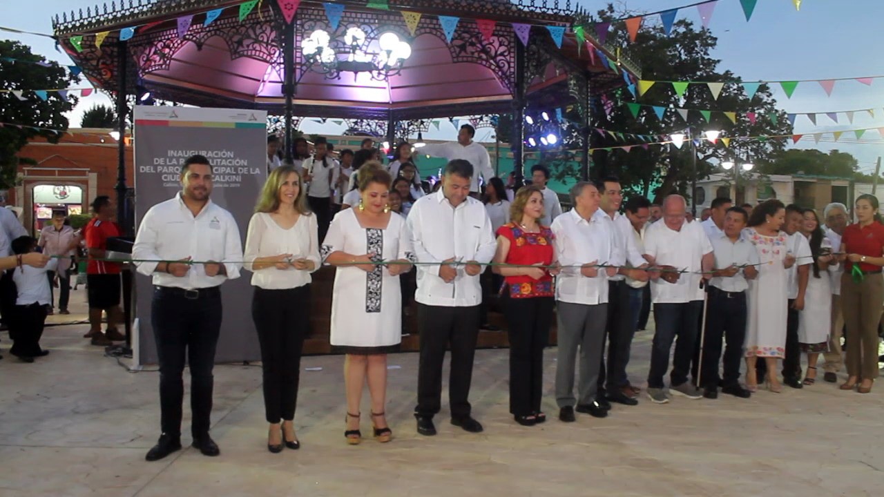 5 de julio de 2019. En un ambiente de fiesta popular, numerosos calkinienses atestiguaron esta tarde la inauguración de la restauración de la plaza principal de la ciudad. Ahí, junto al nuevo kiosco, el gobernador Carlos Miguel Aysa González, acompañado de Roque Sánchez Golib, presidente municipal; Victoria Damas de Aysa, presidenta del DIF Estatal; y otros funcionarios estatales y municipales, cortaron el listón inaugural de esta obra esperada desde hace varios años y que viene a embellecer el Centro Histórico de este lugar.