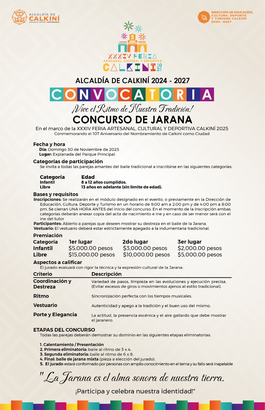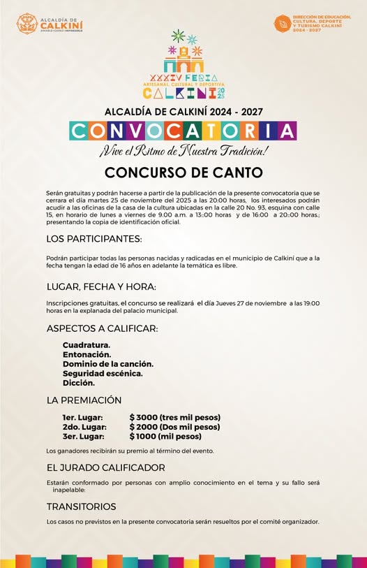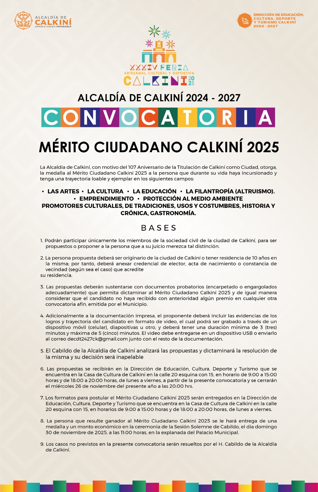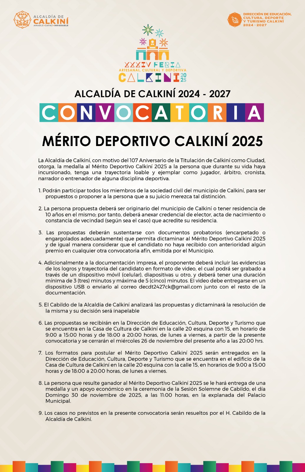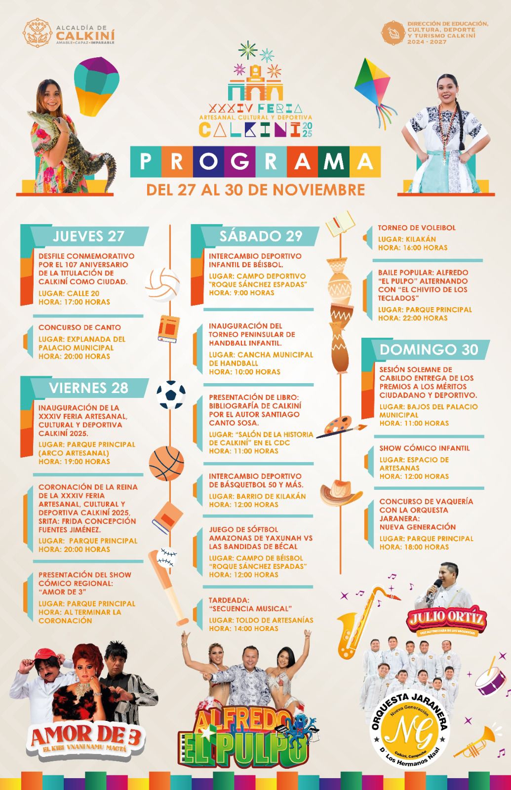 Sábado 29 de noviembre de 2025 (clic): Partidos de Béisbol, Handball y Básquetbol / Presentación del libro "Bibliografía de Calkiní" / Juego de Sóftbol: "Amazonas" de Yaxunah y "Bandidas" de Bécal / Tardeada / Baile Popular con Alfredo "El Pulpo" y "El Chivito de los Teclados". |