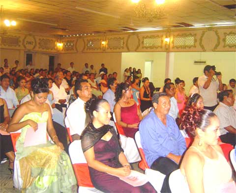 por sus padrinos en las primeras filas del salón