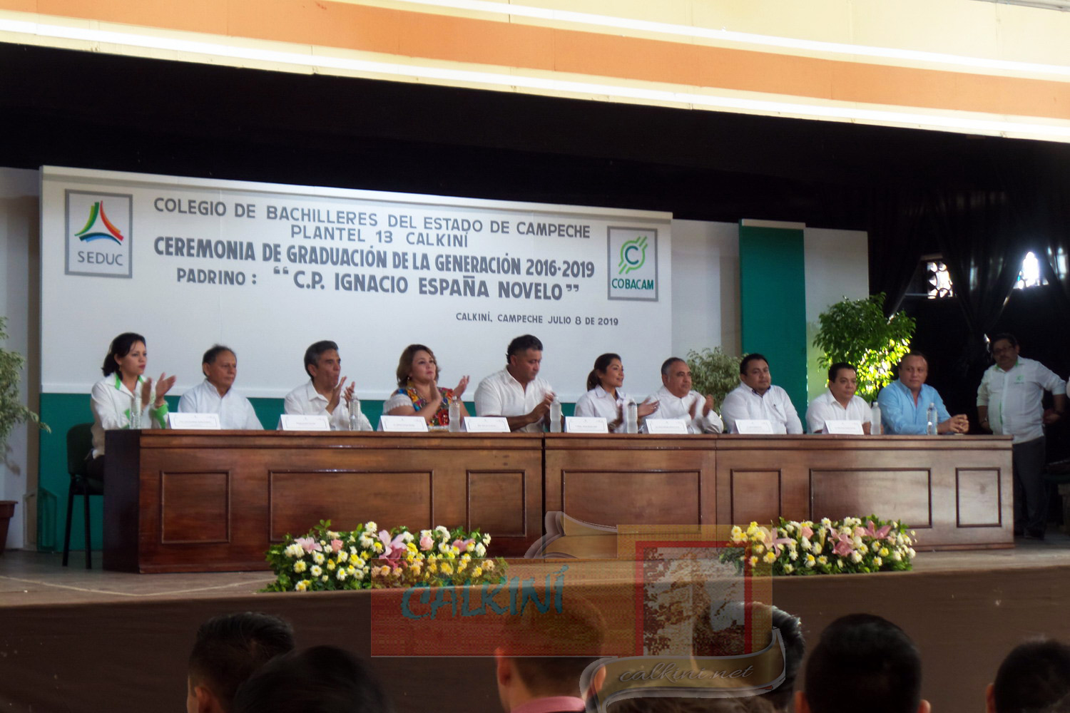 El evento fue presidido por la directora general del Cobacam, Adlemi Ramírez Santiago (en representación del Secretario de Educación de Campeche, Ricardo Medina farfán); el presidente municipal de Calkiní, Roque Sánchez Golib, y su esposa Olivia Yah; el padrino de la Generación 2016-2019 de la institución educativa, Ignacio España Novelo; y otros invitados especiales.