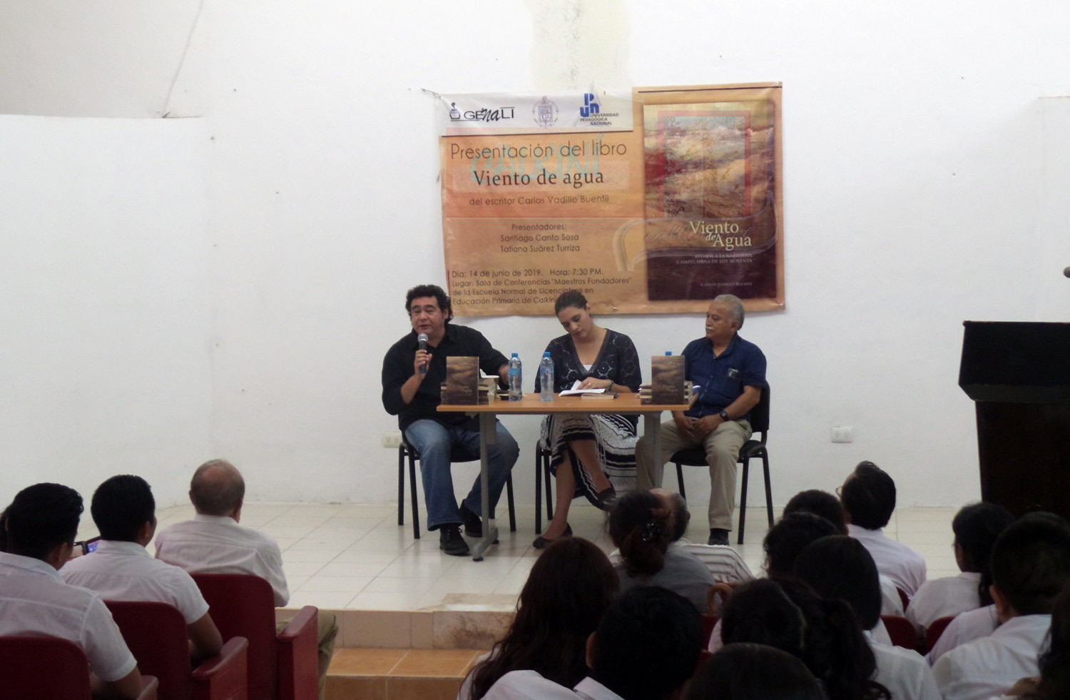 Anoche, en la Sala de Conferencias "Maestros Fundadores" de la Escuela Normal de Licenciatura en Educación Primaria de Calkiní, fue presentado el libro de ensayos "Viento de Agua" del escritor campechano Carlos Vadillo Buenfil. El evento fue organizado por el grupo cultural "Génali", la Unidad 041 de la Universidad Pedagógica Nacional y la ENLEP. Los comentarios estuvieron a cargo de Santiago Canto Sosa, Tatiana Suárez Turriza y el autor.