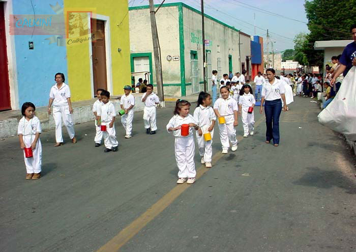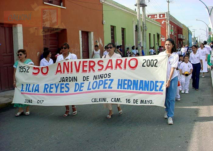 Calkiní, jueves 16 de mayo de 2002.- Alumnos, maestros, padres de familia y algunos ex alumnos del Jardín de Niños "Lilia Reyes de López Hernández" realizaron un Desfile Conmemorativo del 50º Aniversario de la escuela, en el segundo día del programa de actividades.