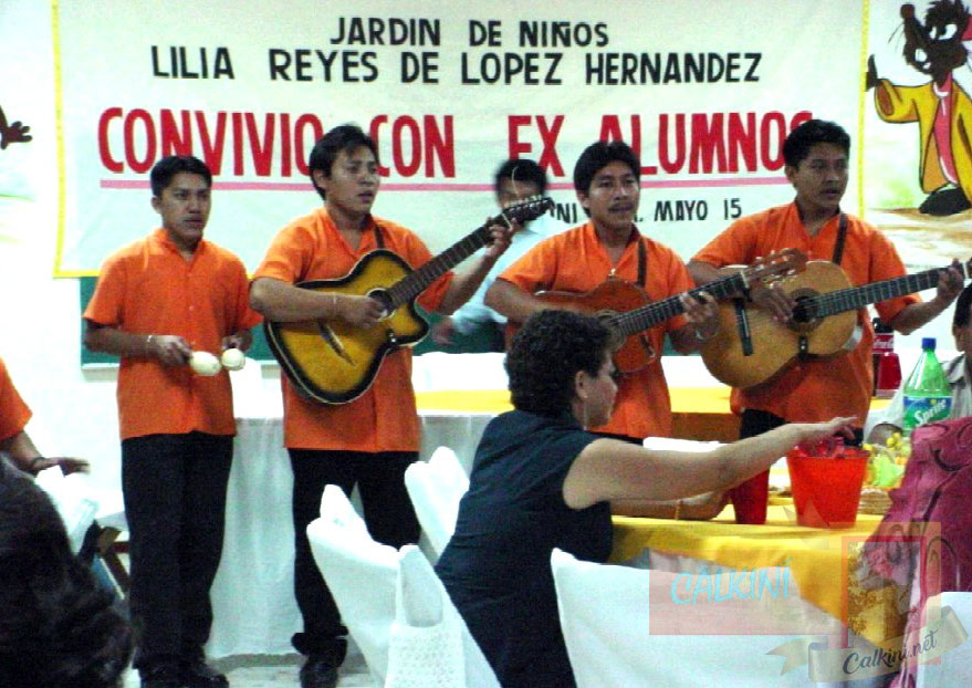 A las 10:00 p.m. un grupo de ex alumnos y el personal docente del Jardín de Niños "Lilia Reyes de López Hernández", que dirige la maestra Gilda, cenaron en el Salón de Canto, acompañados de la música del grupo "Seis cuerdas para el alma". |