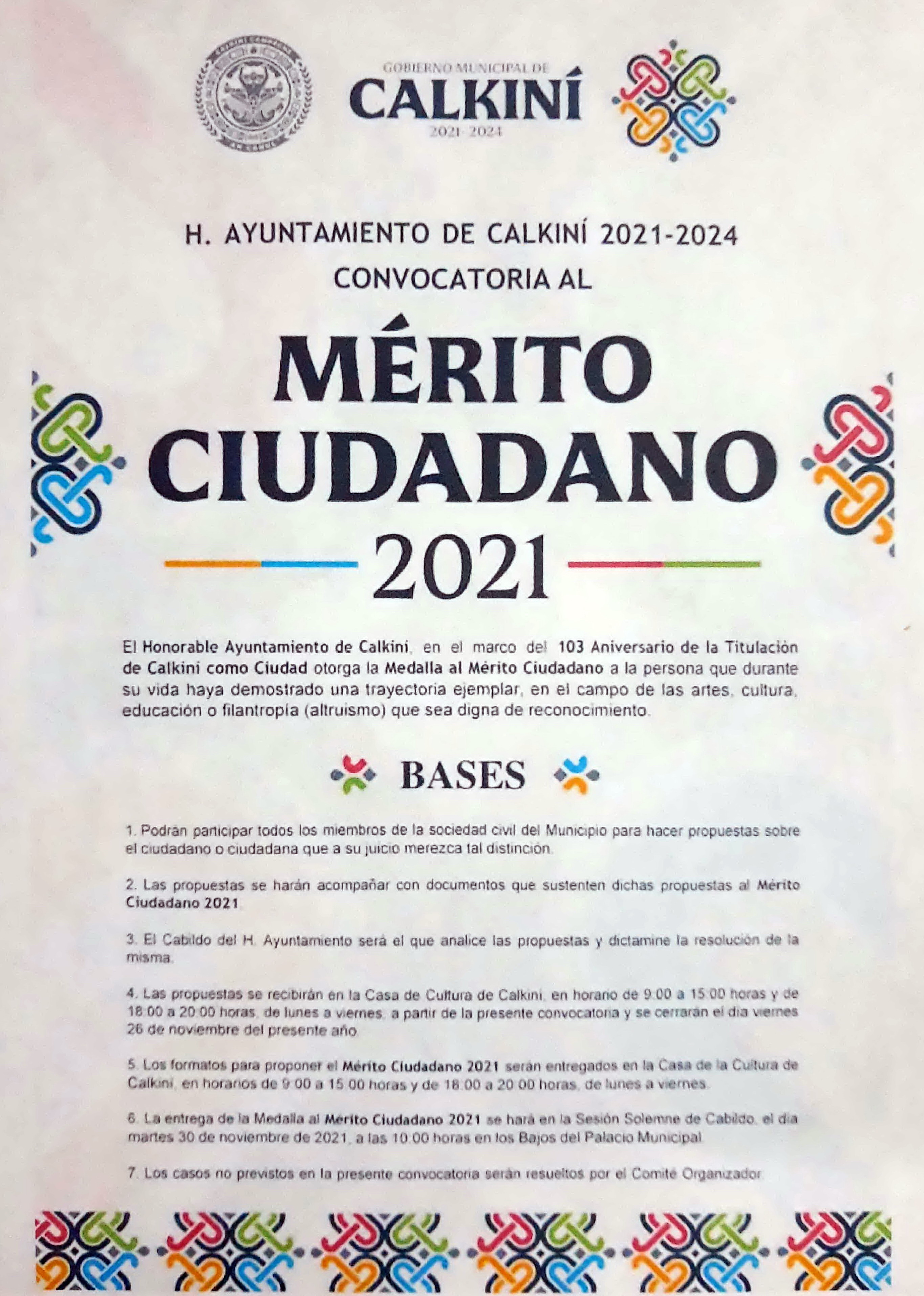El H. Ayuntamiento de Calkiní, con motivo del 103 Aniversario de la Titulación de Calkiní como Ciudad, otorga la Medalla al Mérito Ciudadano 2021 a la persona que durante su vida haya demostrado una trayectoria ejemplar en el campo de las artes, cultura, educación o filantropía (altruismo) que sea digna de reconocimiento. |
