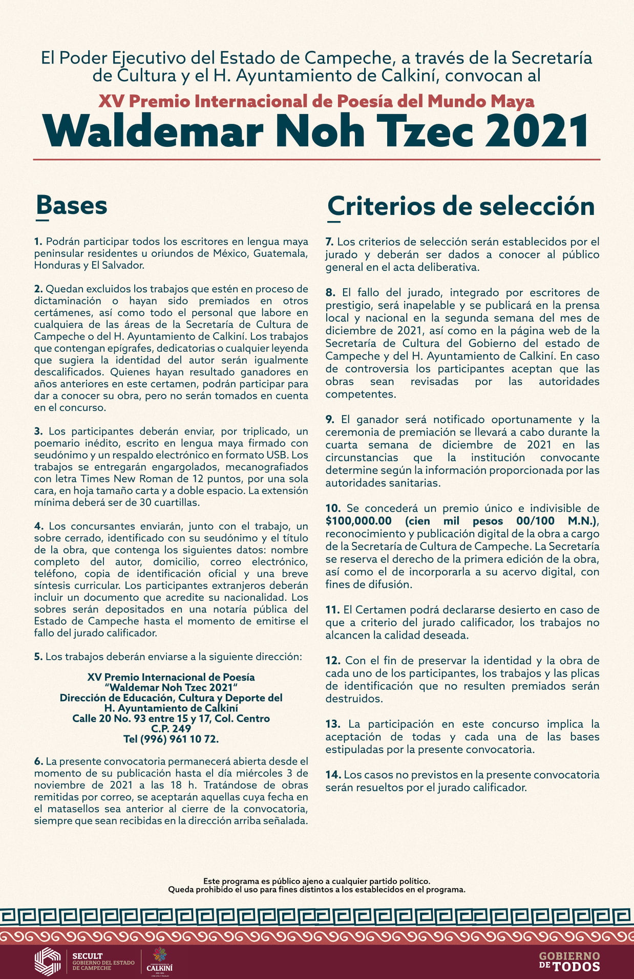 La información detallada sobre las bases de participación podrá encontrarse en las redes sociales de la Secretaría de Cultura del Estado de Campeche (Cultura Campeche).
