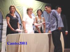 Las autoridades subieron al estrado para entregar diplomas a Gorety Pacheco Zapata, Anahí Balam Caamal y Karime Chí, por sus cinco años de permanencia como alumnas en la institución, y a todos los participantes por su asistencia en el Curso 2002-2003.