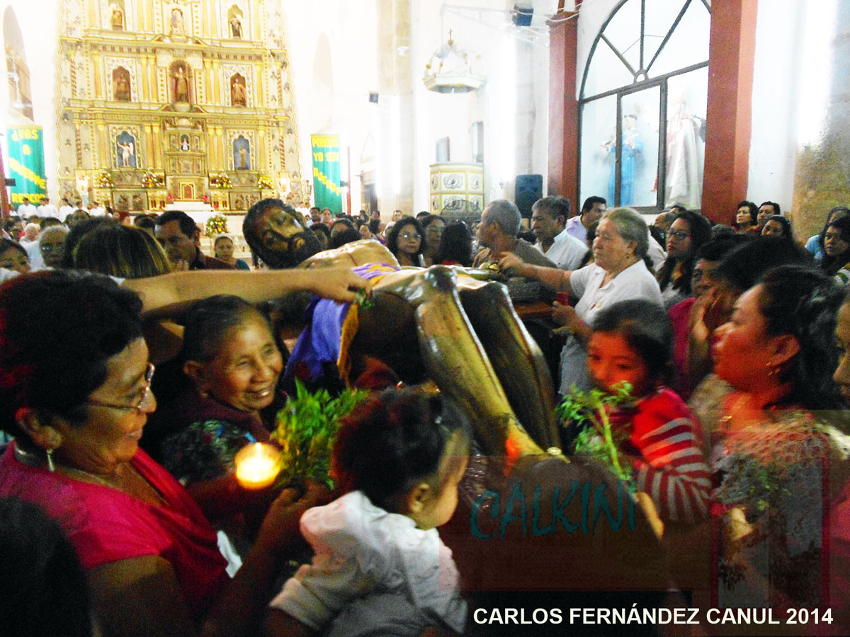 En ese momento, cientos de manos se abalanzaron hacia el Cristo, lo abrazaron y rodearon, cobijándolo con un calor humano, patentizándole de esta manera la fe y el amor hacia la venerada imagen. No podía faltar doña Lucía Ac, quien desde hace años, con un gran manojo de la aromática ruda, embalsama la imagen; al igual, otras personas hicieron lo mismo. Hubo un momento en que los cargadores no podían controlar la ola humana que se acercó a la imagen; pero con mucha educación, poco a poco, los feligreses veneraron al más “antiguo calkiniense” que -según historiadores- arribó a estas tierras en 1565.