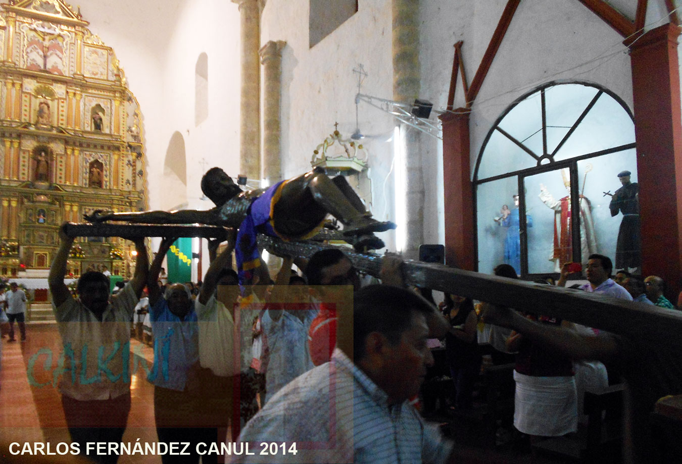 Cuando se abrieron las puertas del nicho, el vicario de la parroquia, Pbro. Manuel May Euán, inciensó la imagen, para luego iniciar las difíciles maniobras dirigidas por Manuel Briceño Blanco; ayudantes Alfredo Cuevas, Manuel López Trejo, Genaro Cocom, Ernesto Ávila Segovia y otros, quienes cada año auxilian en esta bajada. Al traspasar la puerta de la capilla, la imagen asomó en la nave central del templo; se escucharon aplausos, tronar de voladores. El coro “Shalom” entonaba el Himno al Cristo (escrito por Jorge Anchevida Chan). Una vez en el centro del recinto, el pesado crucifijo fue sacado de su base, y en hombros se le trasladó hasta un catafalco instalado en el centro del templo.