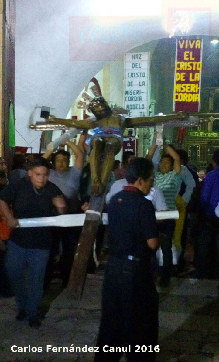 Calkiní, 31 de octubre de 2016.- Anoche, con solemne misa y nutrida procesión con la imagen del Cristo de la Misericordia, que recorrió el centro histórico de esta ciudad, culminó su "Novenario", en el que durante un mes hicieron entrada más de 30 gremios, rosarios y misas, y a donde acudieron infinidad de feligreses y devotos de esta venerada imagen.