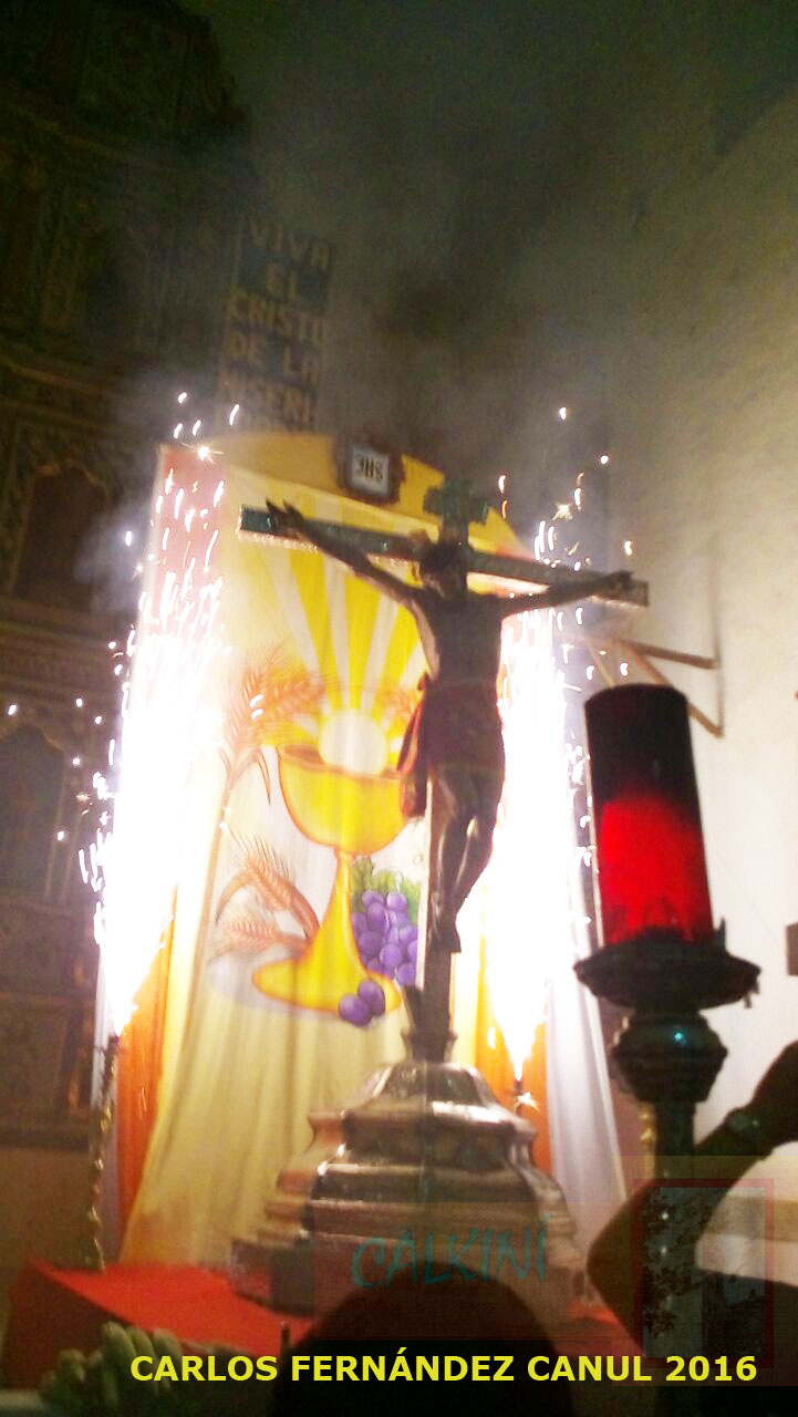 En las afueras del templo se escuchaba el tronar de voladores, anunciando de esta manera el inicio del "Novenario" a esta venerada imagen, que los calkinienses han adoptado como su patrono. Enseguida, se apagaron las luces y se encendieron a los pies de la cruz "luces pirotécnicas" que iluminaron a la imagen, animando más el júbilo de los feligreses que abarrotaron el recinto.