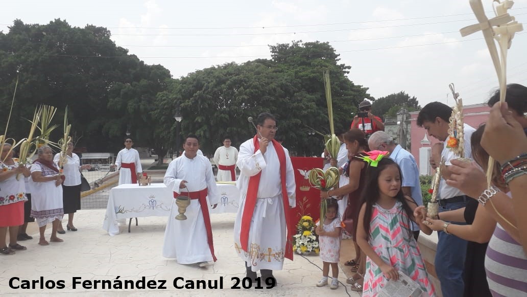 14 de abril de 2019 (Carlos Fernández).- Cientos de feligreses fueron testigos de la tradicional bendición de palmas este Domingo de Ramos, que marca el inicio de la Semana Mayor y donde se recuerda la Pasión, Muerte y Resurrección de Jesús. Se celebraron distintas misas para la bendición de palmas. En la mañana, una procesión salió de la capilla del barrio de La Concepción, encabezada por el Pbro. Juan Kantún Huchim. Un grupo de niños representando a los apóstoles, y numerosas gentes que portaban palmas de guano arribaron al templo principal.
