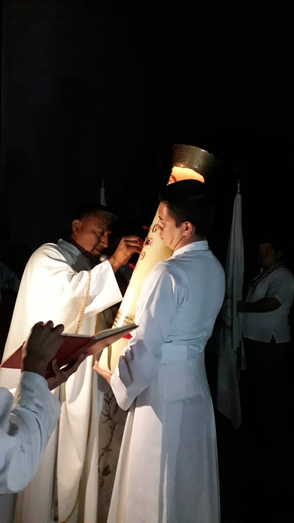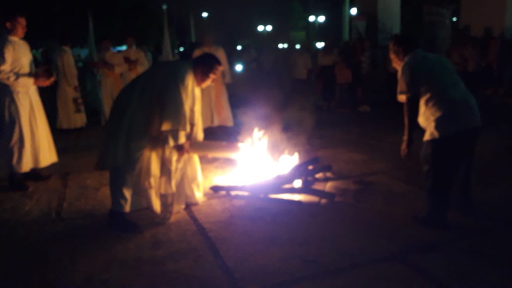 21 de abril de 2019 (Carlos Fernández Canul).- Los católicos celebraron la Resurrección de Jesús, con Solemne Eucaristía. El rito inició a las 8:00 pm, con un templo en penumbras y en silencio: el párroco Juan Kantún Huchim bendijo el fuego a las puertas del recinto, encendió el Cirio Pascual, e hizo incisión en el cirio "símbolo de Cristo, luz del mundo"; grabó una cruz y la primera y última letra del alfabeto griego -alfa-omega- -principio y fin-, junto con las cifras del año en curso. Luego, cargando el cirio, recorrió el pasillo central y se dirigió al altar mayor.