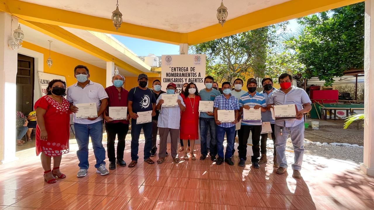 La presidenta municipal, Juanita Cortés Moo, acompañada del secretario del Ayuntamiento, Manuel Arvez Pérez, hizo entrega de los nombramientos a los Comisarios Municipales de San Antonio Sahcabchén, Raúl Ku Uicab; Santa Cruz Pueblo, Carlos Mis Cauich; Concepción, Juventino Tamay Tamay; y a los Agentes municipales de San Nicolás, José Elviro Collí Caamal; Xcacoch, El Juan Bautisante Chan Itzab; San Antonio Chunhuás, José Lorenzo Pech Chan; Santa María, Feliciano Chan Canul; Pucnachén, José Alfredo Naal Dzul; Tankuché, Moisés Canul Pech; Isla Arena, Eduardo Canul Ucán.