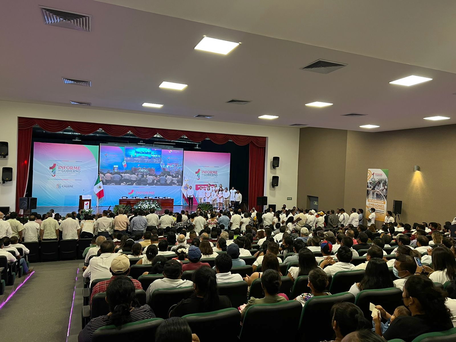 El teatro de la ciudad “Pedro Raúl Suárez Cárdenas” fue escenario donde la presidenta Juanita Cortés presentó su primer informe de actividades, en el cual rindió cuentas de acciones más importantes realizadas por su administración en este primer año de gobierno. Secundada por miembros del cabildo municipal y de autoridades del gobierno estatal, dio cumplimiento a lo establecido en la Ley Orgánica de los Municipios del Estado y del Reglamento Interior del Ayuntamiento de Calkiní para la rendición de cuentas al pueblo, informando el estado que guarda la administración pública municipal. |