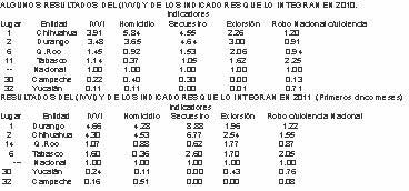 | Podemos observar en las modificaciones entre los años de 2010 y 2011 que en la Península de Yucatán, es notable el descenso en cinco lugares del estado de Quintana Roo y por supuesto en nuestra entidad que de acuerdo a estos datos es el estado más seguro en el país. En el listado se incluye el estado de Tabasco que si bien no forma geográficamente parte de la región peninsular tiene colindancia con nuestro estado de Campeche y nos unen con él, lazos culturales, comerciales y sociales; podemos ver que en el conteo nacional, Tabasco, subió cinco lugares al pasar de la posición 11 a lugar 6 y de acuerdo a los indicadores del estudio, el secuestro se duplicó y el delito de extorsión también aumentó. En cuanto al estado de Yucatán tuvo un ascenso marginal de dos posiciones; aún así, junto con Campeche, son las dos entidades más seguras del país. Por último cabe destacar la gran diferencia en las cifras de los índices de violencia entre los estados de Durango y Chihuahua y los de la Región Peninsular. En relación a 2010, Chihuahua bajó 1 lugar en el conteo nacional, en tanto que Durango ocupa el lugar nº1.