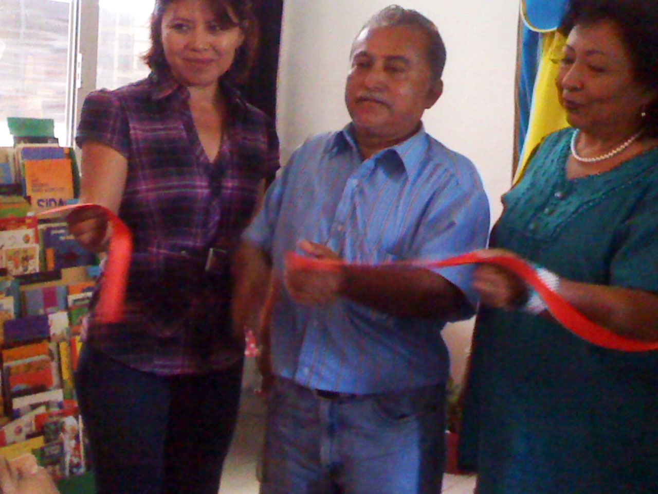 El corte del listón inaugural estuvo a cargo del escritor, acompañado por la directora de la institución, María Candelaria Cárdenas Barrera, y la representante de la Fundación "María Lavalle Urbina" A.C, Angélica Pech Cahuich. |
