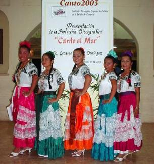 ataviadas con traje típico de Campeche, dieron la bienvenida