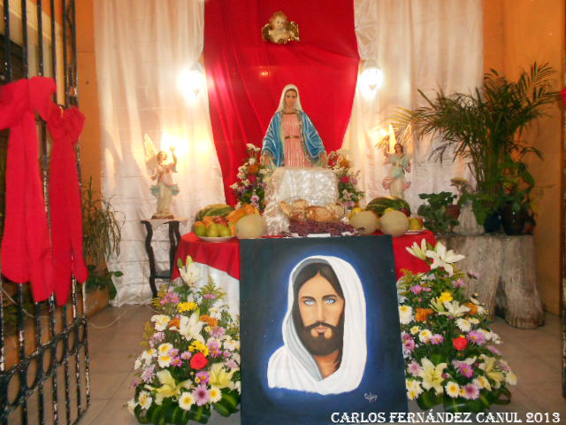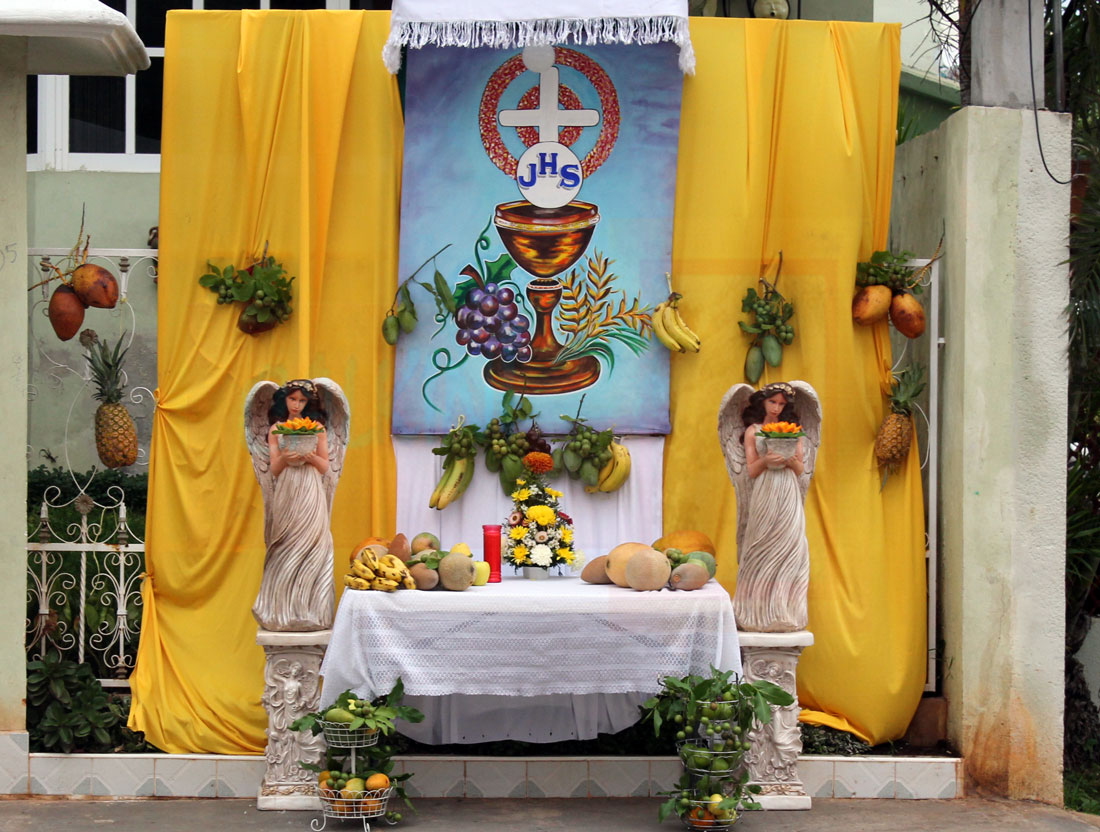 Como es tradición, en varios hogares se instalaron altares, adornados con flores y frutas. Por la lluvia, no fueron visitados por el Santísimo y los fieles. |