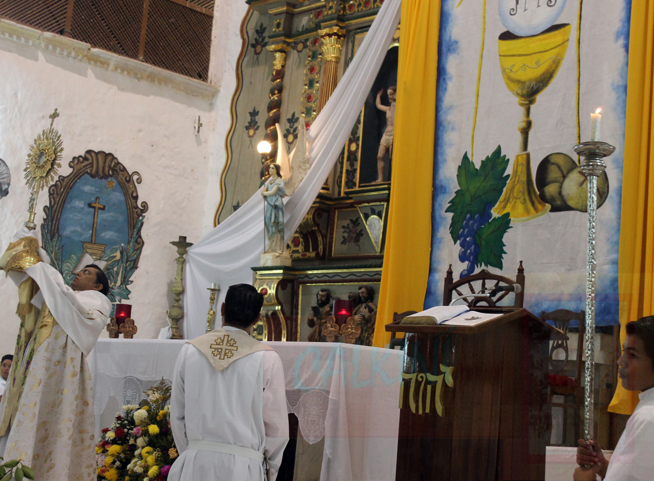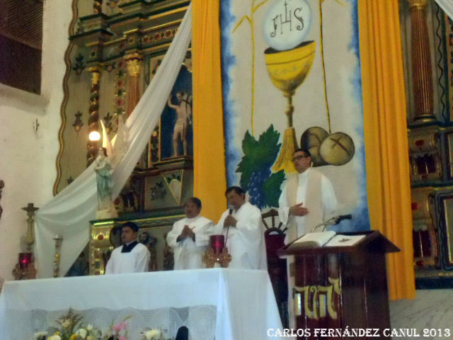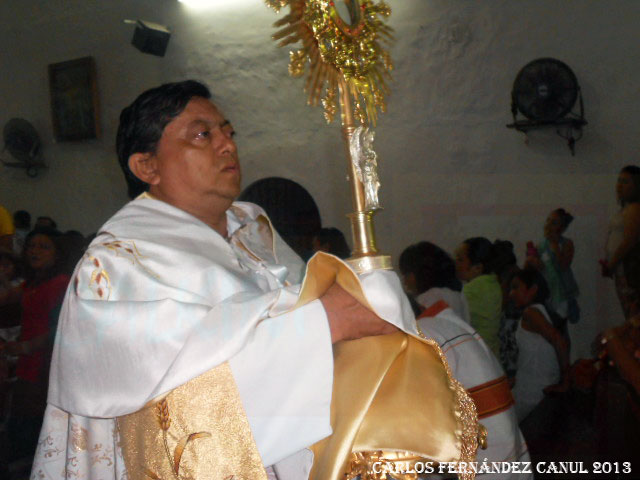 Jueves 30 de mayo de 2013. (Carlos Fernández Canul).- Hoy por la tarde-noche, numerosos fieles recordaron el Corpus Christi con solemne Celebración Eucarística en el templo de San Luis Obispo. La Misa estuvo a cargo del párroco, Pbro. José Luis Canto Sosa, acompañado del Pbro. Marco Antonio Martínez (Rector del Curso Introductorio "Santa María de Guadalupe" de esta ciudad), el diácono Manuel Jesús May y el seminarista Gustavo Kau Cámara.