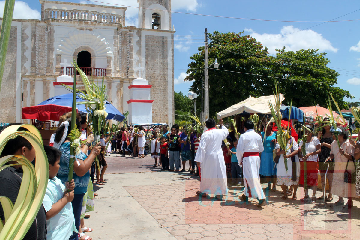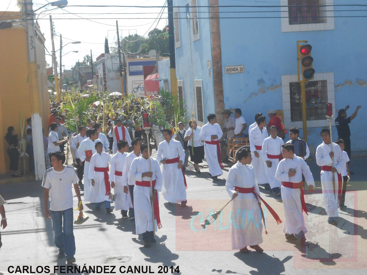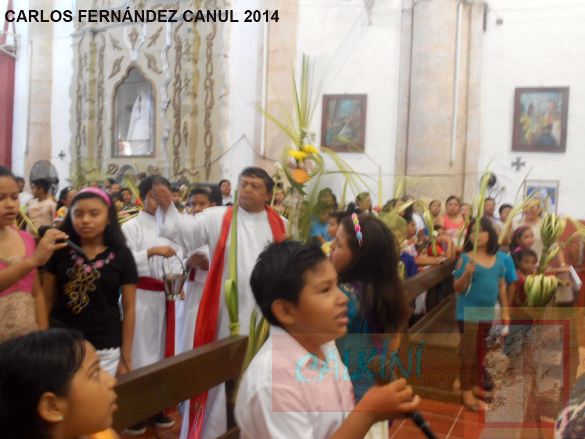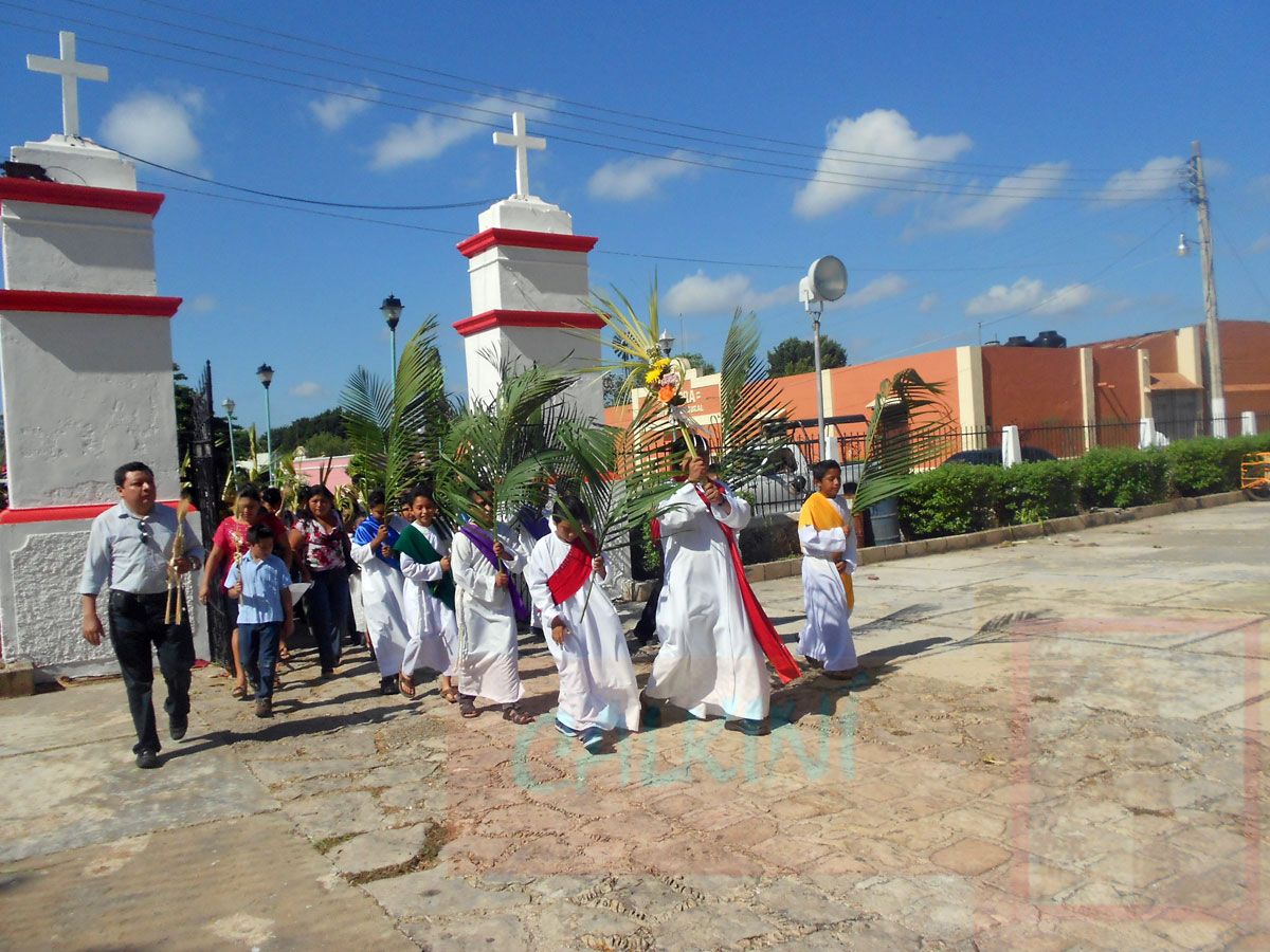 En la misa de 10 de la mañana, la procesión con palmas empezó en la capilla del barrio La Concepción, encabezada por el párroco de Calkiní, acompañado de 12 niños vestidos de apóstoles. Al llegar el templo católico, hizo su entrada emulando a Jesús cuando hizo su entrada triunfal a Jerusalén. "Hosanna al hijo de David, bendito el que viene en nombre del Señor", cantaba el Coro de Niños, para después recorrer el pasillo central de la iglesia, bendiciendo las palmas. Después inició la Eucaristía, donde se leyó la Pasión de nuestro Señor Jesucristo del evangelista san Mateo.