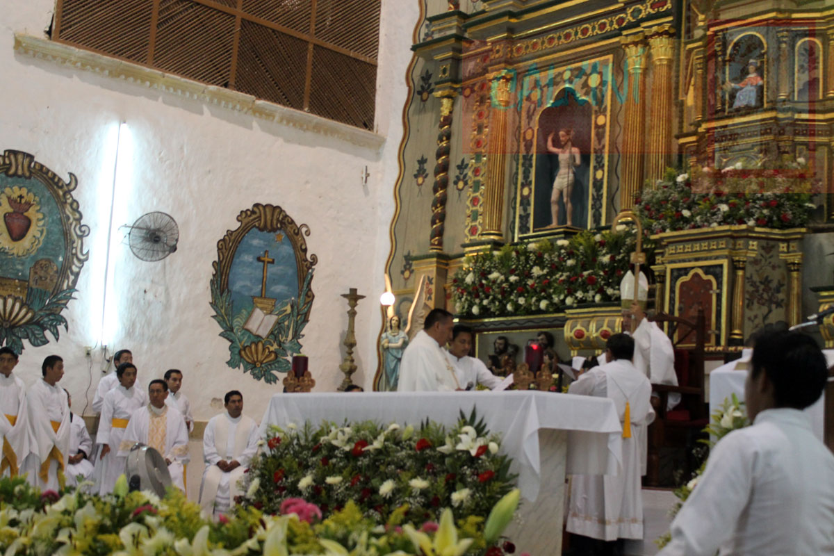 Después se realizaron las intenciones de los fieles y ofrecimiento de las ofrendas, para continuar con el Prefacio, Santo, la Comunión. En procesión, el Obispo llevó al nuevo párroco al Bautisterio, donde le hizo entrega del mismo. Antes de concluir la celebración, el pastor de la grey campechana hizo entrega a Juan de las llaves del Sagrario, por lo que en sus manos llevó la sagrada Custodia para depositarla en el Sagrario, en la capilla del Santísimo. |