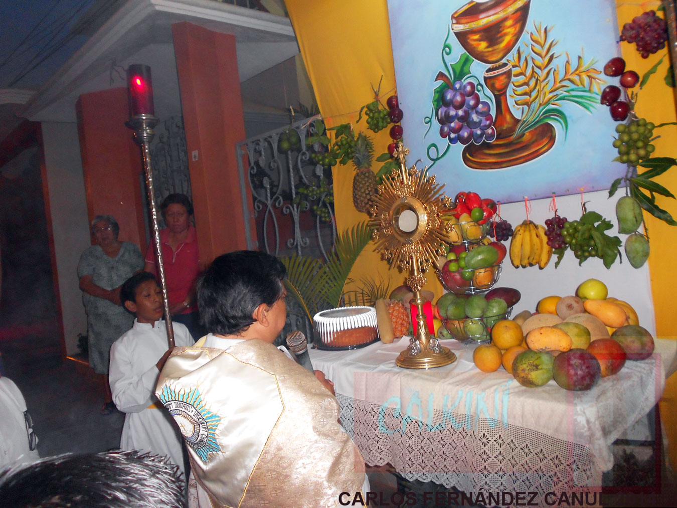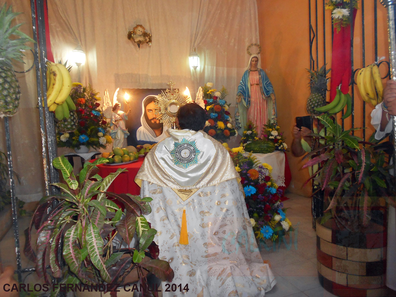 Durante la procesión, el sacerdote fue colocando en cada uno de los altares la custodia con la Sagrada Hostia; arrodillado, fue recitando unas oraciones, para después continuar el recorrido de los demás altares que estaban adornados con frutas, verduras y flores de la región, así como con piezas de pan.