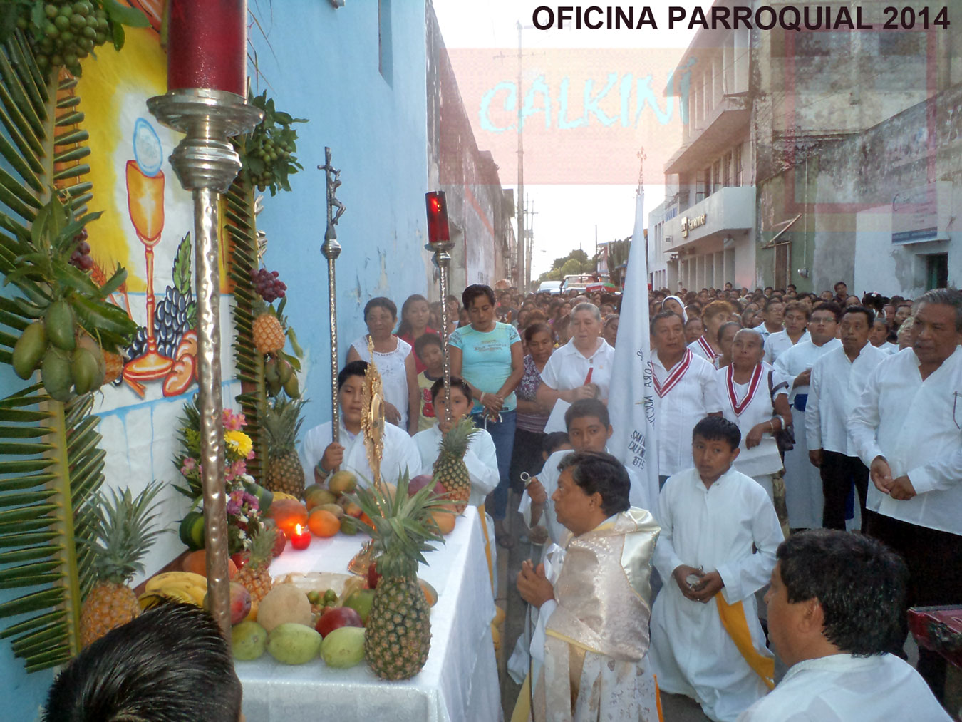 Al concluir la Celebración Eucarística, el párroco Canto Sosa, con el Santísimo Sacramento en las manos, inició la tradicional procesión que salió del templo de San Luis Obispo, para recorrer las principales calles del centro histórico de la ciudad de Calkiní. Como ya es tradición, grupos y movimientos apostólicos parroquiales instalaron siete altares en igual número de hogares. |