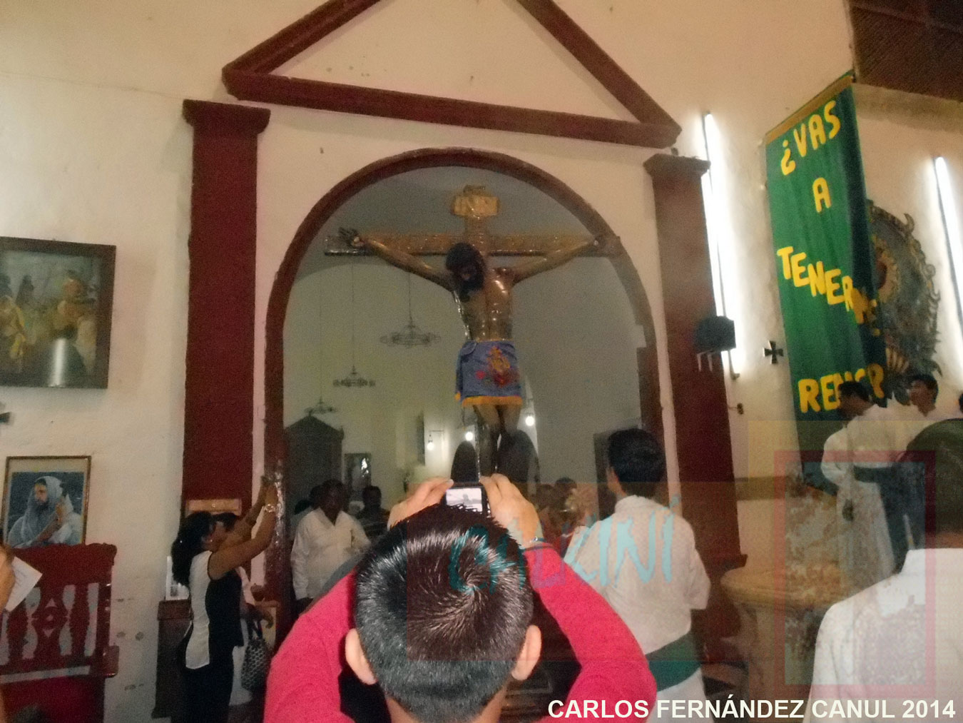 Cuando se abrieron las puertas del nicho, el vicario de la parroquia, Pbro. Manuel May Euán, inciensó la imagen, para luego iniciar las difíciles maniobras dirigidas por Manuel Briceño Blanco; ayudantes Alfredo Cuevas, Manuel López Trejo, Genaro Cocom, Ernesto Ávila Segovia y otros, quienes cada año auxilian en esta bajada. Al traspasar la puerta de la capilla, la imagen asomó en la nave central del templo; se escucharon aplausos, tronar de voladores. El coro “Shalom” entonaba el Himno al Cristo (escrito por Jorge Anchevida Chan). Una vez en el centro del recinto, el pesado crucifijo fue sacado de su base, y en hombros se le trasladó hasta un catafalco instalado en el centro del templo.