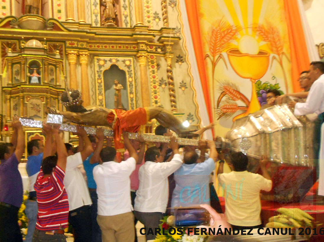 Eran las 8:00 p.m. cuando un grupo de acólitos iniciaron los preparativos para las maniobras de la subida de la imagen; se agregaron brazos de adultos y jóvenes, quienes cargaron en hombros la sacra imagen para conducirla hacia el lugar de su altar (al costado oriente del altar mayor). Ahí, fue ensamblada la pesada cruz en la "pliana base", para levantarla y colocarla enfrente del pueblo, que le tributó el calor humano, así como cantos, aplausos, vivas, al tiempo que el coro de voces "Shaloom" interpretaba el Himno que le compuso Jorge Anchevida Chan.