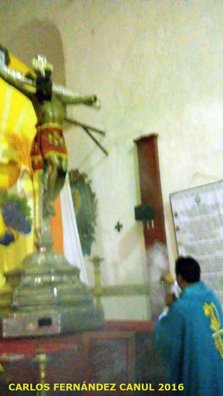 En las afueras del templo se escuchaba el tronar de voladores, anunciando de esta manera el inicio del "Novenario" a esta venerada imagen, que los calkinienses han adoptado como su patrono. Enseguida, se apagaron las luces y se encendieron a los pies de la cruz "luces pirotécnicas" que iluminaron a la imagen, animando más el júbilo de los feligreses que abarrotaron el recinto.