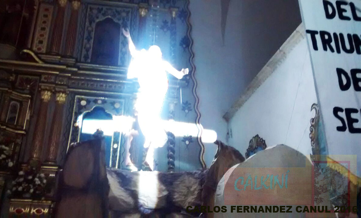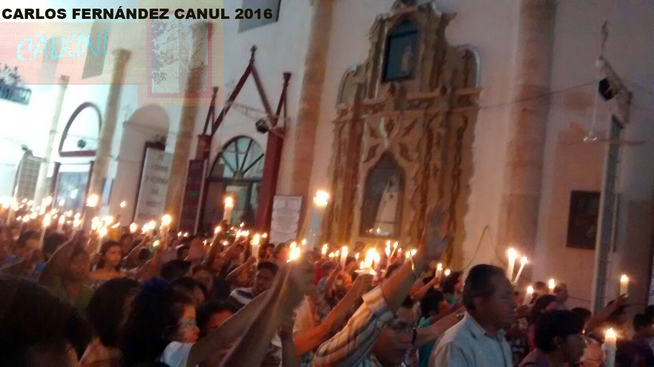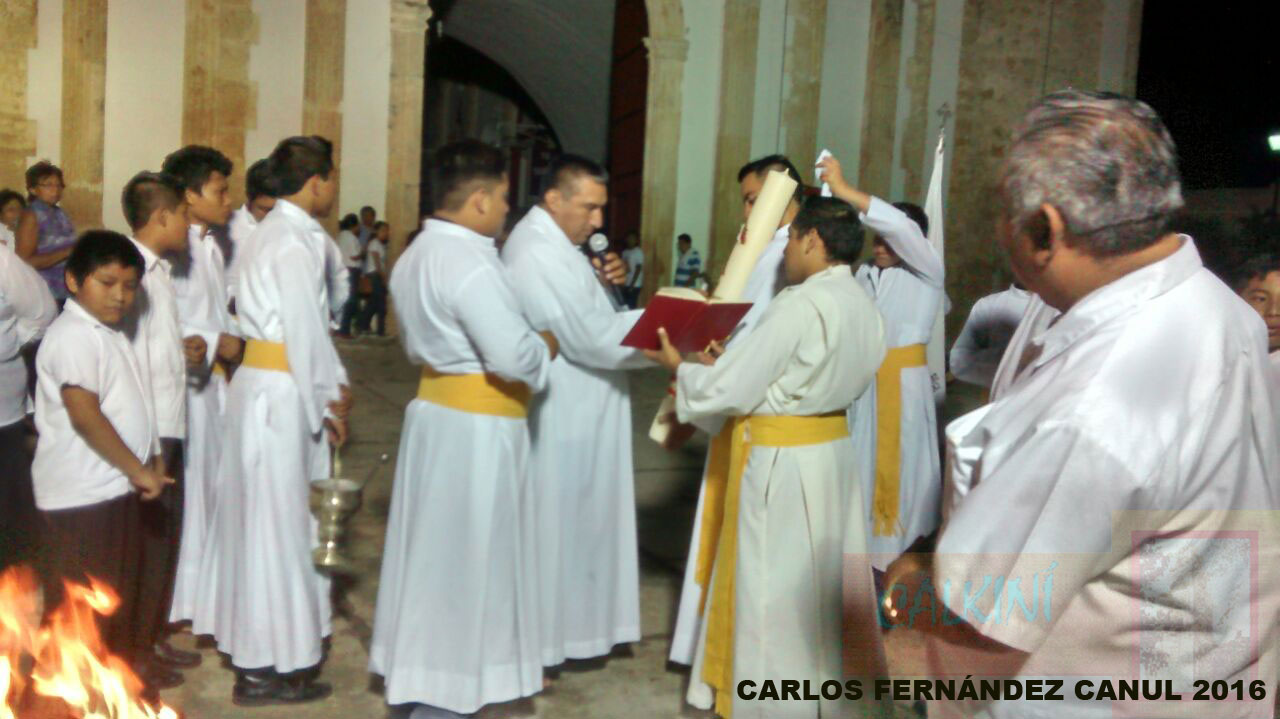 Sábado 26 de marzo de 2016. Por Carlos Fernández Canul.- Con el ritual de bendición del fuego, encendido del Cirio Pascual, que significan la luz de Cristo, realizado a las puertas del templo de San Luis Obispo, a cargo del párroco Juan Eliodoro Kantún (quien luego de incrustar en el Cirio Pascual los signos de Alfa y Omega y otros que simbolizan las llagas de Cristo, para entrar en procesión al templo a oscuras, símbolo de luto), iniciaron las lecturas del Antiguo Testamento: Pregón Pascual, Libro del Génesis, del profeta Ezequiel y otros.