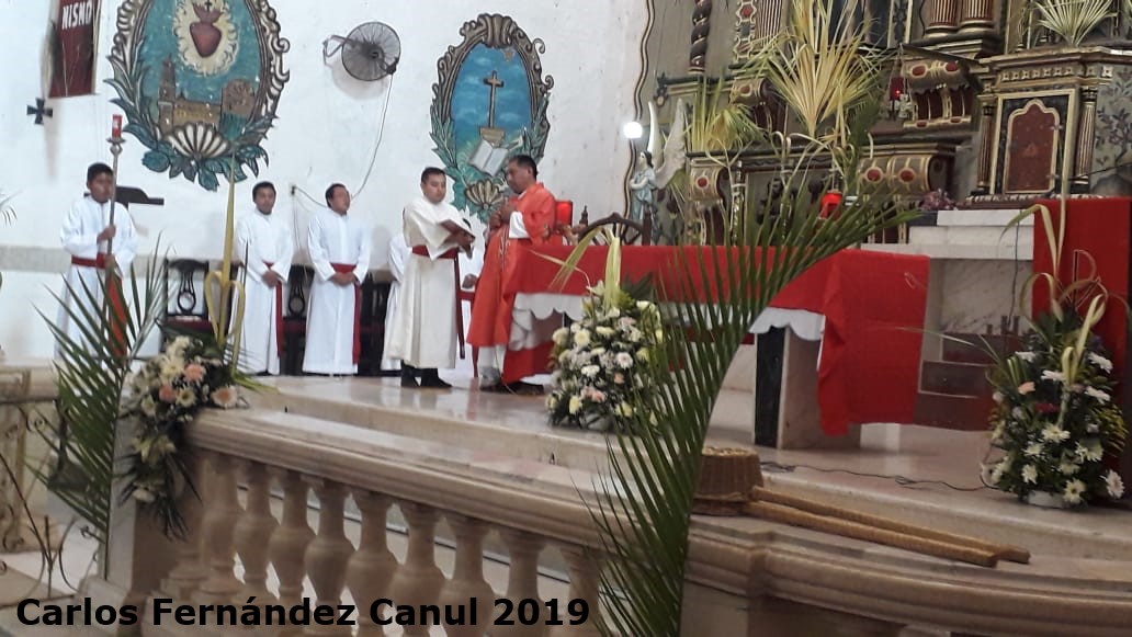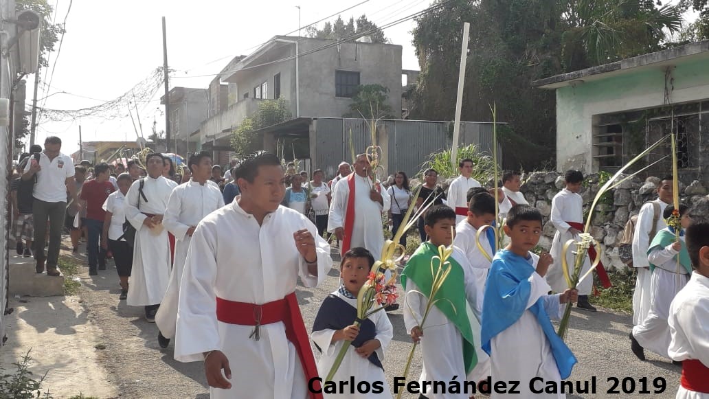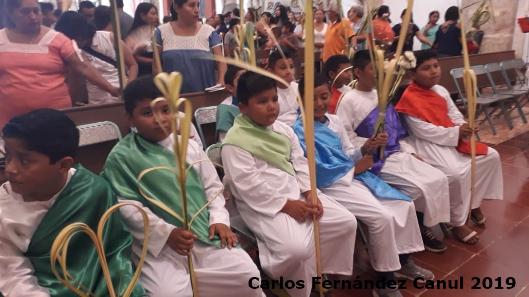 14 de abril de 2019 (Carlos Fernández).- Cientos de feligreses fueron testigos de la tradicional bendición de palmas este Domingo de Ramos, que marca el inicio de la Semana Mayor y donde se recuerda la Pasión, Muerte y Resurrección de Jesús. Se celebraron distintas misas para la bendición de palmas. En la mañana, una procesión salió de la capilla del barrio de La Concepción, encabezada por el Pbro. Juan Kantún Huchim. Un grupo de niños representando a los apóstoles, y numerosas gentes que portaban palmas de guano arribaron al templo principal.